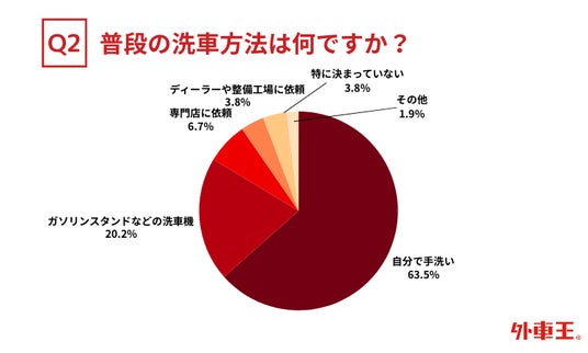 洗車方法については、「自分で手洗い」が63.5%と圧倒的な多数を占めています。この回答からは、愛車を丁寧に、隅々まで洗いたいというオーナーの強いこだわりが感じられます。