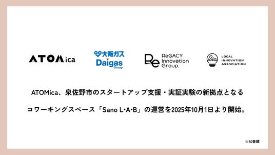 ソーシャルコワーキング(R)︎スタートアップの株式会社ATOMica(本社:宮崎県宮崎市、代表取締役:嶋田 瑞生、南原 一輝、以下「ATOMica」)は、大阪ガス株式会社、ReGACY Innovation Group株式会社と連携し、一般社団法人ローカルイノベーション協会(※1)が実施する「Izumisano Startup Support Program」の一環として整備された、コワーキング機能を備えたイノベーション創出拠点(※2)「Sano L・A・B」の運営を2025年10月1日より開始します。