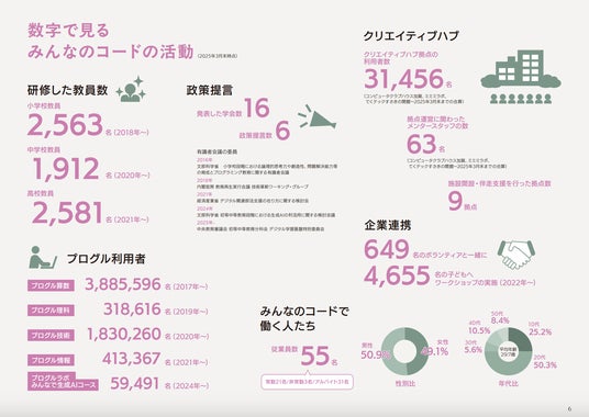 本冊子は、これまでの実績を振り返るとともに、次の10年を見据えた展望を共有する特別号です。これまでに届けてきた授業用プログラミング教材や教員研修、クリエイティブハブ、政策提言などの取り組みを、数字とストーリーの両面から紹介しています。