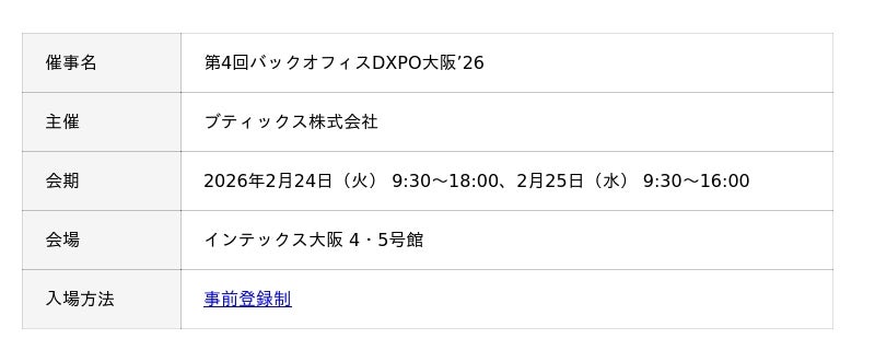 株式会社アイエンター(本社:東京都渋谷区、代表取締役:入江恭広、以下「アイエンター」)は、2026年2月24日(火)~25日(水)にインテックス大阪で開催される「バックオフィスDXPO大阪’26」に出展します。