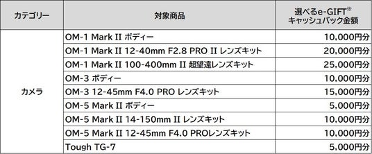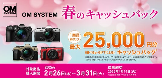 OMデジタルソリューションズ株式会社が展開する映像製品ブランド「OM SYSTEM」は、対象のミラーレス一眼カメラ(レンズキットを含む)、およびコンパクトデジタルカメラをご購入いただいたお客さまを対象に、1商品あたり最大25,000円分の「選べるe-GIFT」をプレゼントする『OM SYSTEM 春のキャッシュバック』キャンペーンを2026年2月26日(木)より実施します。