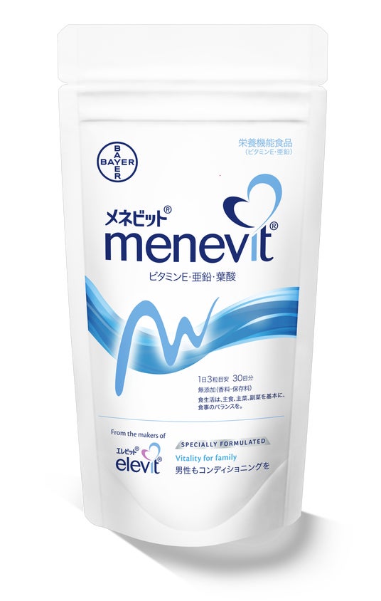 「メネビット(R)」は、プレナタル**サプリメント「エレビット(R)」シリーズから生まれた男性用サプリメントです。抗酸化作用を持つ栄養素として代表的なビタミンEや、コンディショニングに大切な細胞の代謝をサポートするミネラルの亜鉛など、男性の妊活を支える9つの栄養素をバランスよく配合したマルチビタミンサプリメントとなっています。