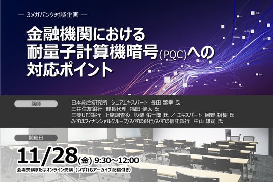 株式会社セミナーインフォ(本社:東京都千代田区 代表:小西 亘)は、2025年11月28日(金)に「<3メガバンク対談企画>金融機関における耐量子計算機暗号(PQC)への対応ポイント」を開催いたします。