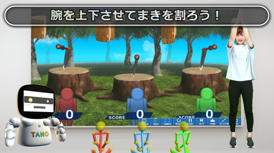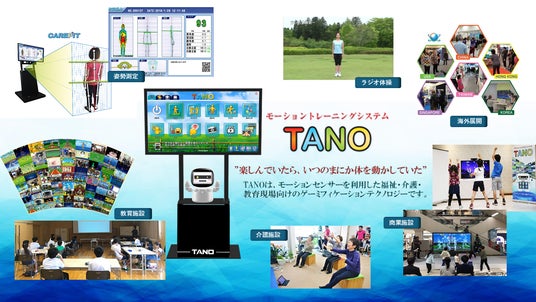 TANO(タノ)は、センサーの前に立つ・座るだけで体がそのままコントローラーとなり、画面上のコンテンツを操作できる非接触・非装着型の運動支援・脳活性化ツールです。