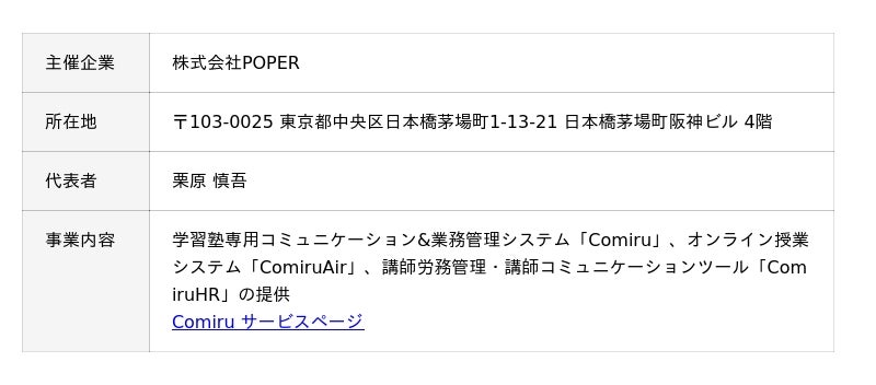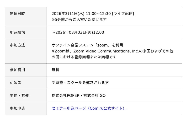 参加無料・オンライン開催のため、全国どこからでもご参加いただけます。教育の質を高めたいと考える塾・スクール運営者にとって、今後の指導や教室づくりを見直すきっかけとなる内容です。