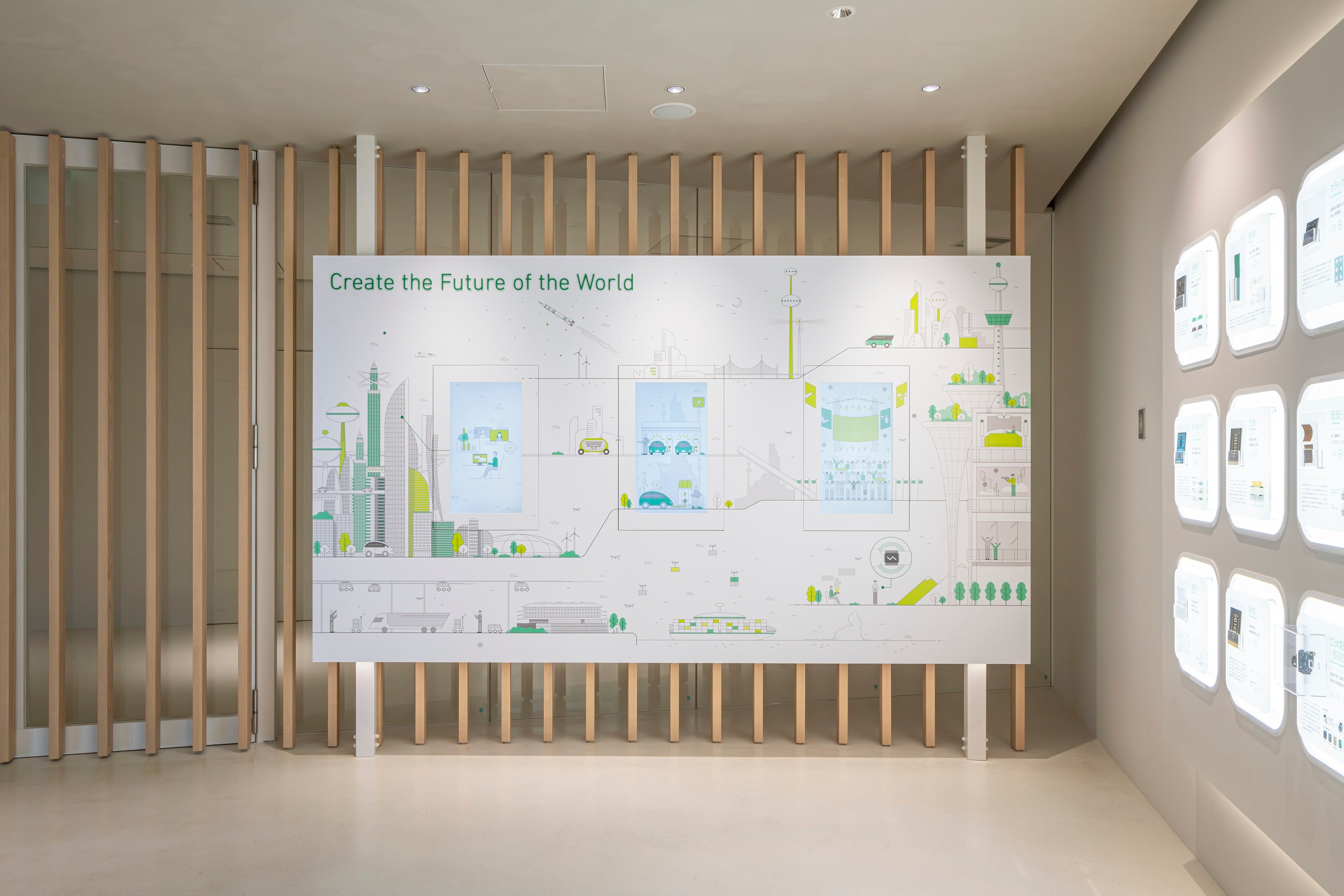 目に見えにくい電子材料を体験的に理解できる場を設け、技術の社会的意義を伝えるとともに、ブランド価値の向上にもつなげた点が評価された。展示空間はデジタルとアナログを融合させ、タッチウォールによる製造工程の体験や未来都市を描いたパネル、実物を手元で確認できる仕掛けを配置。来訪者は情報を受動的に受け取るのではなく、自ら気づき、触れ、考える能動的な体験を通じて技術の魅力に触れられる。対話を誘発する空間構成やグラフィックの調和により、技術と人を結ぶ印象的なショールームとなっている。