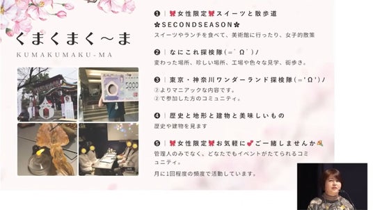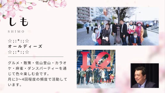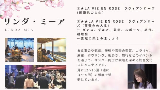 - 活動内容:お食事会や観劇、美術や音楽の鑑賞、カラオケ、麻雀、ボウリング、街歩き、旅行などのイベントを通じて、メンバー同士が親睦を深める総合文化コミュニティ