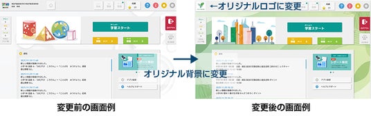 『天神』のロゴ(左)が、設定ひとつで『貴塾のロゴ』(右)に。背景色も塾のイメージカラーに統一可能。