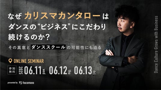 ウェルネス/運動施設向けオールインワン・マネジメントシステム「hacomono」を提供する株式会社hacomono(東京都渋谷区:代表取締役CEO 蓮田 健一 以下、hacomono)は、ダンスの可能性を“ビジネス”として切り拓いてきた第一人者、カリスマカンタロー氏(株式会社アノマリー 代表取締役CEO)をゲストに迎えた特別オンラインセミナーを開催します。