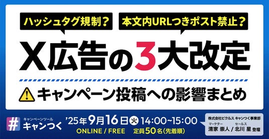 キャンペーンツール「キャンつく」を提供する株式会社ピクルス(以下、ピクルス)は、9月16日(火)無料ウェビナー『【2025年最新】X広告の3大改定・キャンペーン投稿への影響まとめ』を開催します。