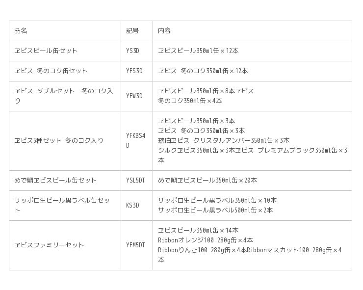 この他にも今年発売10年目を迎え、中味とパッケージに磨きをかけた「琥珀ヱビス クリスタルアンバー缶セット」や、根強い人気の「サッポロ生ビール黒ラベル缶セット」、家族で嬉しい「ヱビスファミリーセット」など、幅広いお客様にお楽しみいただける各種のギフトアイテムを取り揃えました。