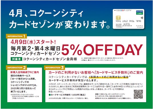 2025年4月にコクーンシティカードセゾンの特典を大幅リニューアル。新特典として、「毎月第2・第4水曜日 コクーンシティカードセゾン 5%OFF DAY」をスタートしました。