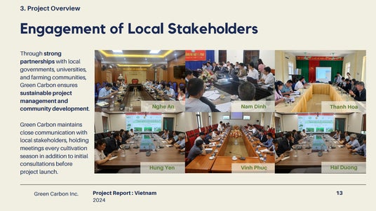 また、ベトナム政府や国際機関と協働し、農業革新を主導してまいります。Green Carbonが参画する世界経済フォーラム主導のベトナムフード・イノベーション・ハブ(FIH)、ベトナム政府主導の「100万ヘクタールプロジェクト」を通じて、米の収量と品質を向上させながら、稲作の脱炭素化に取り組んでまいります。