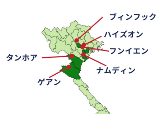 本プロジェクトは、2024年1月(一期作目)よりベトナム北部ゲアン省で始動しました。その後、同年6月(二期作目)よりゲアン、ナムディン、ヴィンフック、タンホア、フンイエン、ハイズオンの6エリアにプロジェクトを拡大しています。