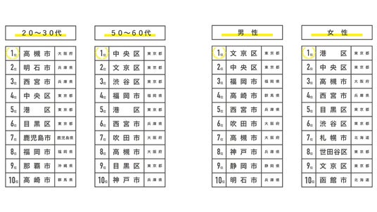 20代・30代のTOP3は「高槻市(大阪府)」「明石市(兵庫県)」「西宮市(兵庫県)」と関西圏の都市が独占