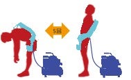 スイッチ操作で空気圧を調整しながら、前屈から上体を起こす動作を5回行います。空気圧の力で股関節や脊椎をストレッチすることで、短時間で理想的な姿勢へと導き、股関節などの可動域拡大が期待できます。