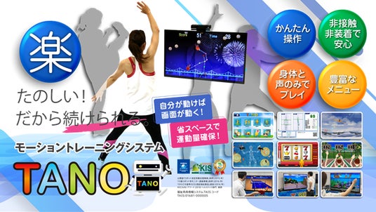 TANOは、センサーの前に立つ・座るだけで、体そのものがコントローラーとなる、非接触・非装着型の運動支援ツールです。約300種類以上のコンテンツを搭載し、体操、認知トレーニング、脳活性化プログラムなど、多彩なメニューをゲーム感覚で楽しむことができます。
