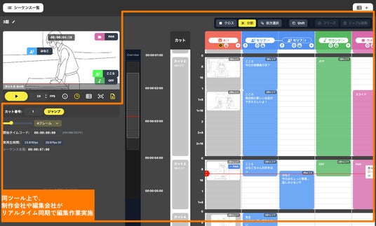 リアルタイムで非同期に他制作関係者へ共有し、編集会社とのデータ連携や、オフライン編集時に手作業で行うタイムシートへの差分更新作業を大幅に削減。