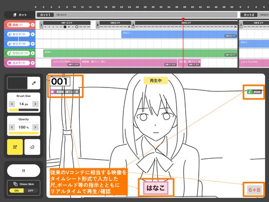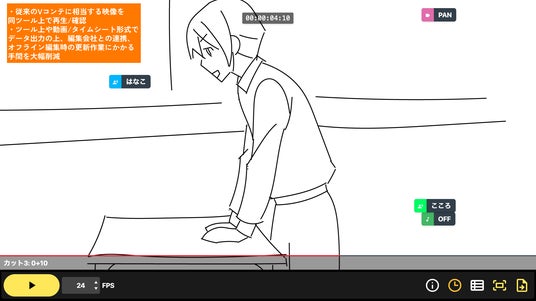 web撮影ビューワー上で、従来のVコンテに相当する映像をそのまま再生できる。そして他の工程で利用できるよう、動画やタイムシート形式でのエクスポートが可能。