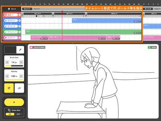 タイムシートを書くように、尺やボールド指示などを画面上部のタイムラインエディタに入力。