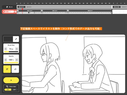 イラスト作成後は絵コンテのフォーマットでデータ出力も可能。(現状はタブレットでの使用を想定)