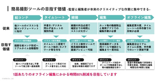 複数の開発領域での技術検証を進めている中で、技術検証・開発が一定進んでいる「簡易撮影ツール」について、2025年10月に試験導入を開始できる段階となりました。このツールは、絵コンテをもとに簡易的に映像化する「コンテ撮(Vコンテ制作)」やカットの順番や長さなどを調整する「編集」の工程に使用されるもので、「イラスト制作機能」「web撮影ビューワー機能」の2つの機能で価値を実現していきます。実際の作画や美術が完成する前に、仮映像をもとにスタッフ間の共通認識を形成することで、制作の効率化・高品質化・トラブル回避につながる重要な工程です。
