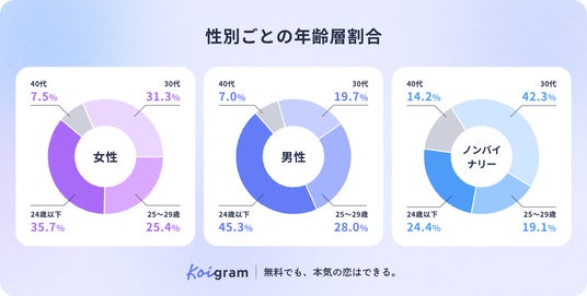 女性は24歳以下が35.7%と最も多く、25~29歳が25.4%、30代が2番目に多い31.3%を占め、40代が7.5%という割合でした。男性は24歳以下が45.3%と最も多く、ついで25~29歳が28.0%、30代が19.7%、40代が7.0%という割合でした。ノンバイナリーは24歳以下が24.4%、25~29歳が19.1%となっており、30代が42.2%と最も多く、40代が14.2%という割合でした。