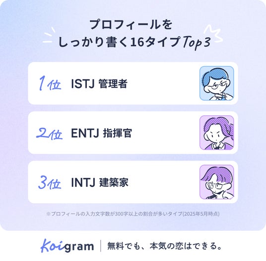 「プロフィールをしっかり書く16タイプ」1位は、ISTJ(管理者)でした。ついで2位がENTJ(指揮官)、3位がINTJ(建築家)という結果でした。1位だったISTJ(管理者)は、真面目で礼儀正しく誠実と言われているため、タイプの特徴が「Koigram」利用者の行動に如実に現れているといえます。