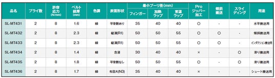 物流現場では、水平ライン、傾斜ライン、急停止・急加速を伴うインダクションライン、横方向から搬送物が合流するライン、搬送物を滑らせるシュートラインなど、用途に応じて搬送用ベルトに求められるニーズは多岐にわたります。これらのニーズにお応えするために、それぞれの用途に対応する機能を付加した搬送用ベルト6品種を新たに開発しました。