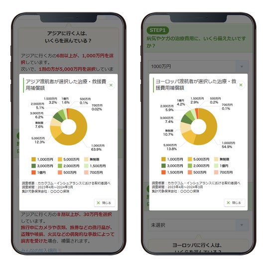 実際の契約者が「病気やケガの治療費に、いくら備えたか」「旅先での持ち物の盗難、破損、事故による損害に、いくら備えたか」を渡航エリアごとにグラフでわかりやすく表示しています。