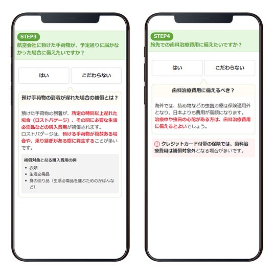 お客さまが海外旅行保険を選ぶうえで優先度の高い補償項目について、絞り込みに役立つヒントを表示します。ヒントを参考にしながら7つの質問に答えていくだけで、ご希望の条件に合った商品に絞り込むことができます。海外旅行保険をはじめて選ぶ方や補償内容のイメージがまだ明確でない方でも、より納得感のある保険選びが可能になりました。