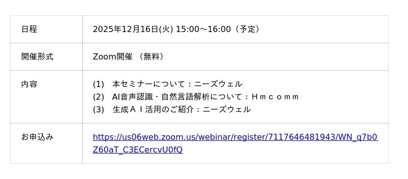 “音”から価値の提供を目指す、Hmcomm株式会社(本社:東京都港区、代表取締役社長CEO:三本 幸司、以下Hmcomm)は、2025年12月16日(火)、株式会社ニーズウェル(本社:東京都千代田区、代表取締役社長:松岡 元、以下ニーズウェル)共催の無料オンラインセミナー「AI音声認識・応答のコンタクトセンター ~AI音声認識・応答の”人に優しい問い合わせ対応”を実現します~」を再放送いたします。