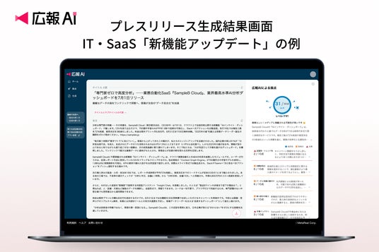 業種特化の専門AI開発・運営を行うメタリアル・グループの株式会社ロゼッタ(本社:東京都千代田区、代表取締役:五石 順一)が提供する、メディアに掲載されやすいプレスリリースを生成・採点可能な『広報AI』が、IT・SaaS業界のプレスリリース作成に対応しました。技術的な専門性をわかりやすく伝えながら、自社サービスの強みを的確にアピールできるリリースの自動生成が可能となります