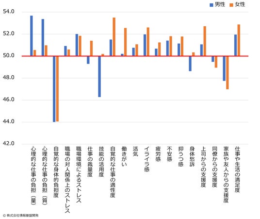 男女差はあるものの、自分のスキルや経験を十分に活用できていないと感じている方の割合が高いことがうかがえます。仕事の質的・量的な負担や心理的なストレス反応の項目で数値が悪くない反面、自身の技能や経験を業務に生かせていないと感じている様子です。