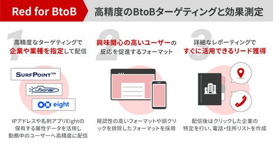 「Red for BtoB」は、高精度なBtoBターゲティングから効果的な広告フォーマットでの配信、成果が見える詳細レポートまで、BtoB広告に必要なすべてをワンストップで提供します。