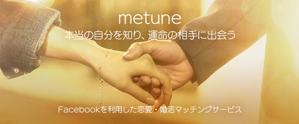 meet(出会い)×fortune(占い)=『metune』とは、“本当の自分を知り、運命の人に出会う”をコンセプトにFacebookを活用した恋活・婚活アプリです。フォーチュンアドバイザー・イヴルルド遙華さんが運命に導かれた素敵な出会いをプロデュース。幸運体質になれる運命占いをベースにマッチングからメッセージのやりとりまでを全面サポートします。