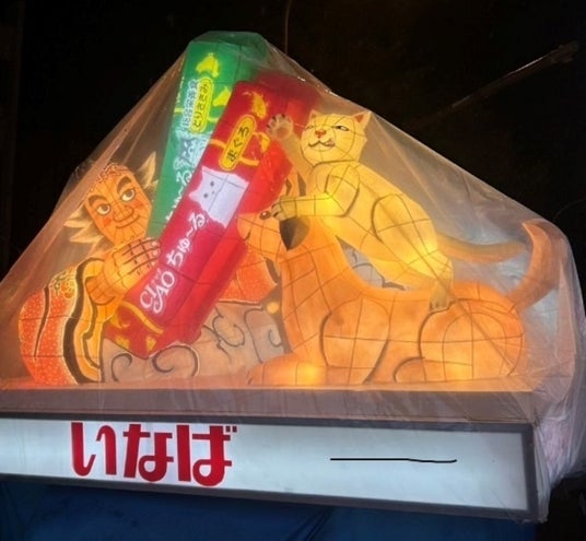 2025年の「ねぶた」も当社グループの代表商品である「いなばライトツナ」や「ちゅ~る」をモチーフに製作。当日は雨が降っていたため防水の布を被せてありますが、本番では力強く練り歩くことができました。