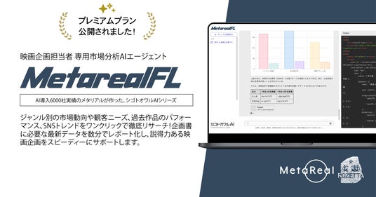 業種特化の専門AI開発・運営を行うメタリアル・グループの株式会社ロゼッタ(代表取締役:五石 順一)は、2025年7月3日(木)、映画企画担当者向け市場分析AI「Metareal フィルム」に月額5万円(税込)で1日20回・月200回使えるプレミアムプランを提供開始しました。
