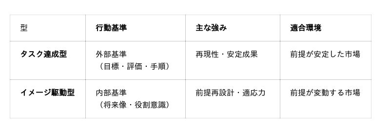 - 市場変化が小さい業界では、目標や手順への適合を重視する「タスク達成型」が安定して評価される
