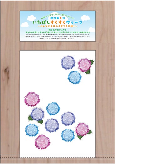 あじさい型のメッセージシールに、「お子さんのかわいいところ、家族の素敵なところ、子育て中のおすすめお出かけスポット、育児時短テクニック、子育て中リフレッシュ方法、利用して良かった区のサービス」などを記入して、大きなパネルに貼って、みんなであじさいの花を咲かせるプロジェクトです。
