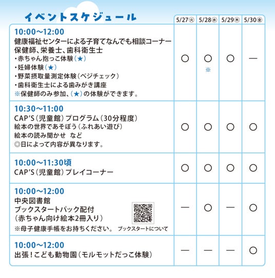 健康福祉センターの保健師、栄養士、歯科衛生士による子育てなんでも相談コーナーやCAP’S(児童館)職員による子どもが楽しめるプログラムのほか、中央図書館によるブックスタートパックの配付など様々なプログラムをご用意しています。最終日には、「出張!こども動物園」がきて、モルモット抱っこ体験ができます。