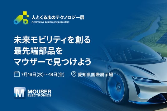 新製品投入(New Product Introduction: NPI)の業界リーダー(TM)として、イノベーションを推進するMouser Electronics(マウザー・エレクトロニクス 本社:米国テキサス州スフィールド、以下マウザー)は、2025年7月16日(水)~18日(金)にAichi Sky Expo(愛知県国際展示場)にて開催される「人とくるまのテクノロジー展 2025 NAGOYA」に出展いたします。期間中は、主要サプライヤー5社とのコラボレーションブースを設置いたします。また、本展示会のONLINE STAGEにも出展し、オンラインでも商品を紹介します。