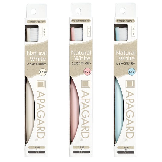 こうした背景からアパガードは環境への取り組みの第一歩として、2022年に「アパガードプレミオトラベルセット eco」と、替え用歯ブラシで携帯用にハンドルが短いショートサイズの「アパガードeco歯ブラシS」を展開しました。そして今回、より多くの方が日常的に使っていただけるよう、通常サイズの「アパガードeco歯ブラシ」を新発売します。本製品のハンドル部分の材質は、炭酸カルシウムを主原料とすることで、プラスチック使用量を51%以上*削減。カラーは素材そのものの色を表す「きなり」と可憐な「さくら」に加え、柔らかな青みを帯びた「あさぎ」を新しく追加した全3色です。シンプルながらも洗練された色合いに仕上げ、ライフスタイルに溶け込む美しさを追求しました。