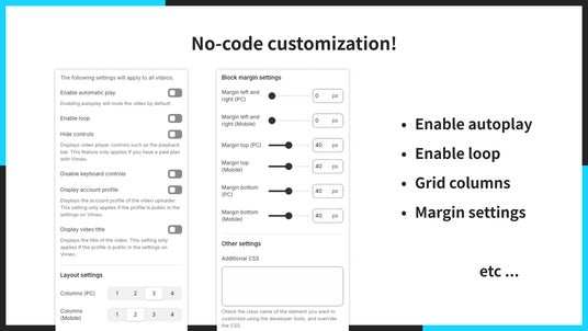 「UR: Smart Vimeo Embed」では、自動再生やループ再生などの動画の再生設定からグリッド表示のレイアウトや余白設定などのデザイン設定まで、全てのノーコードでカスタマイズ可能です。