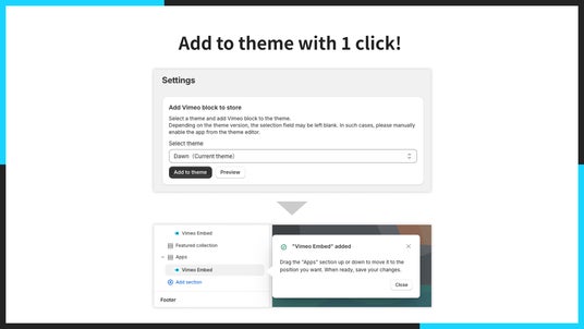 「UR: Smart Vimeo Embed」では、Vimeo 埋め込みのためのアプリブロックを1クリックでテーマに追加できます。難しい操作は必要なく、誰でも簡単にアプリを始められます。
