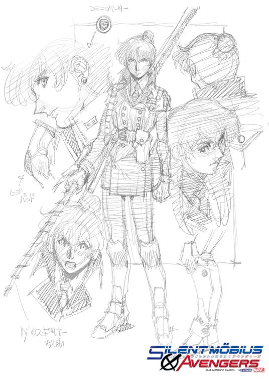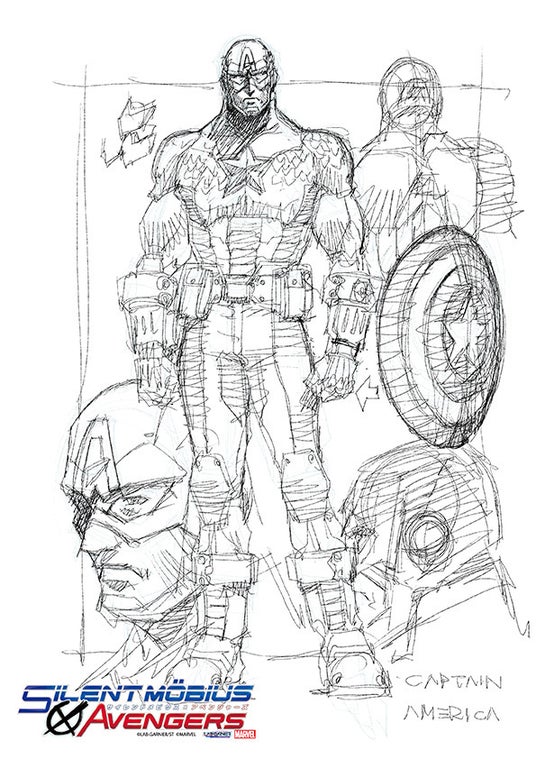 キャラスケッチは、麻宮氏がマーベル側との確認のために描いたもので、サイレントメビウスの主人公「香津美リキュール」とアベンジャーズの「キャプテン・アメリカ」の2点。