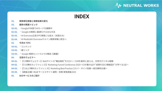 株式会社ニュートラルワークス(本社:神奈川県藤沢市、代表取締役:三木五月、以下「ニュートラルワークス」)は、自社の専門領域であるSEO対策に関して、最新の業界動向をまとめた『SEOトレンドレポート 2025年6月号』を公開いたしました。