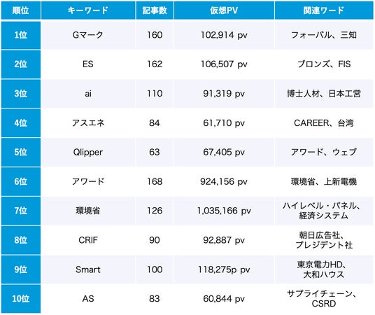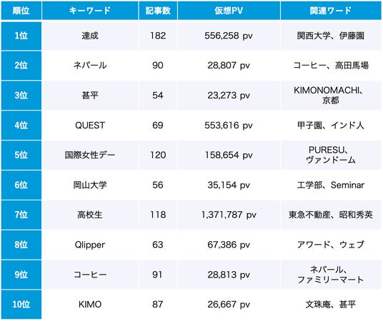 4位は、全国の高校生が社会問題解決について考えアイデアを競う「SDGs QUEST みらい甲子園」の話題。各地で大会やセレモニーが行われ、その模様を地元の新聞やテレビ局が報じた記事が『Yahoo!ニュース』等に転載されて高いPVを得ています。