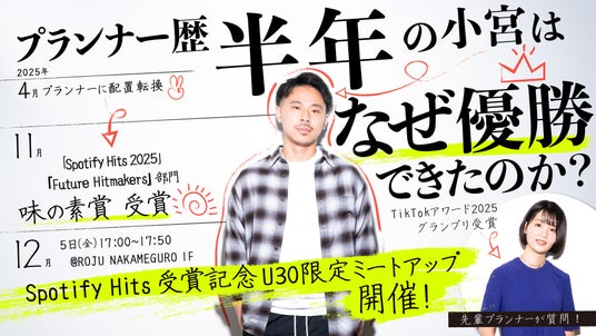 ワンメディア株式会社(本社所在地:東京都渋谷区、代表取締役CEO:明石ガクト、以下、ワンメディア)のプランナーである小宮寛平が、世界で最も人気のあるオーディオストリーミングサービス Spotifyの日本法人スポティファイジャパン株式会社(本社:東京都渋谷区 代表取締役社長:トニー・エリソン、以下Spotify)が主催する「Spotify Hits 2025」において、企業から提供される課題に対しSpotifyだからこそ実現可能なクリエイティブなキャンペーンアイディアを募集する『Future Hitmakers』部門、味の素賞を受賞いたしました。