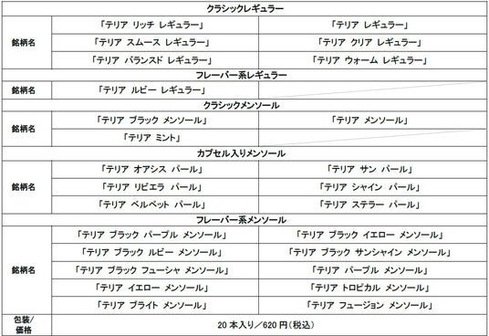 その他、すでに販売している「TEREA(テリア)」26銘柄は下記の通りです。